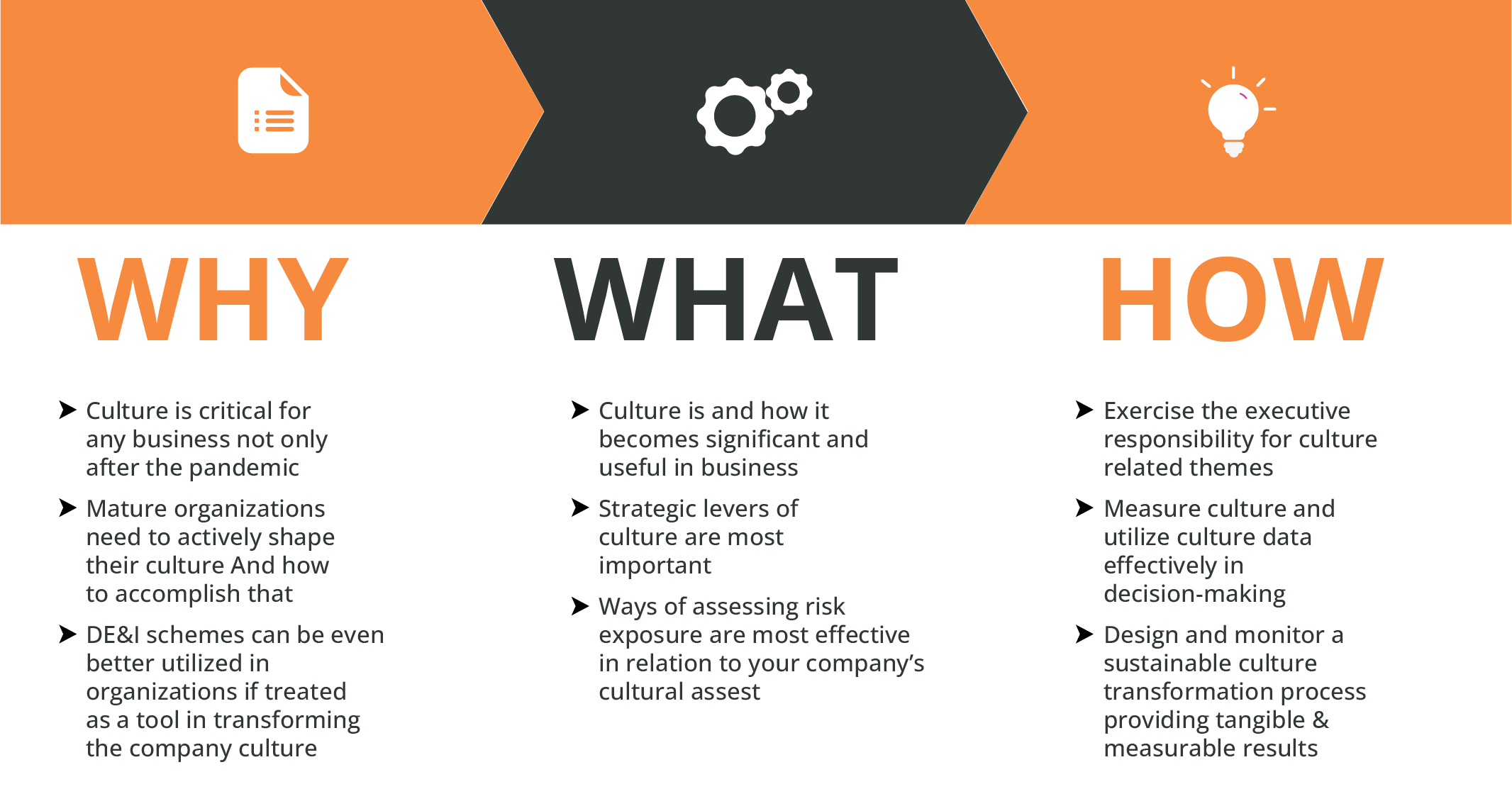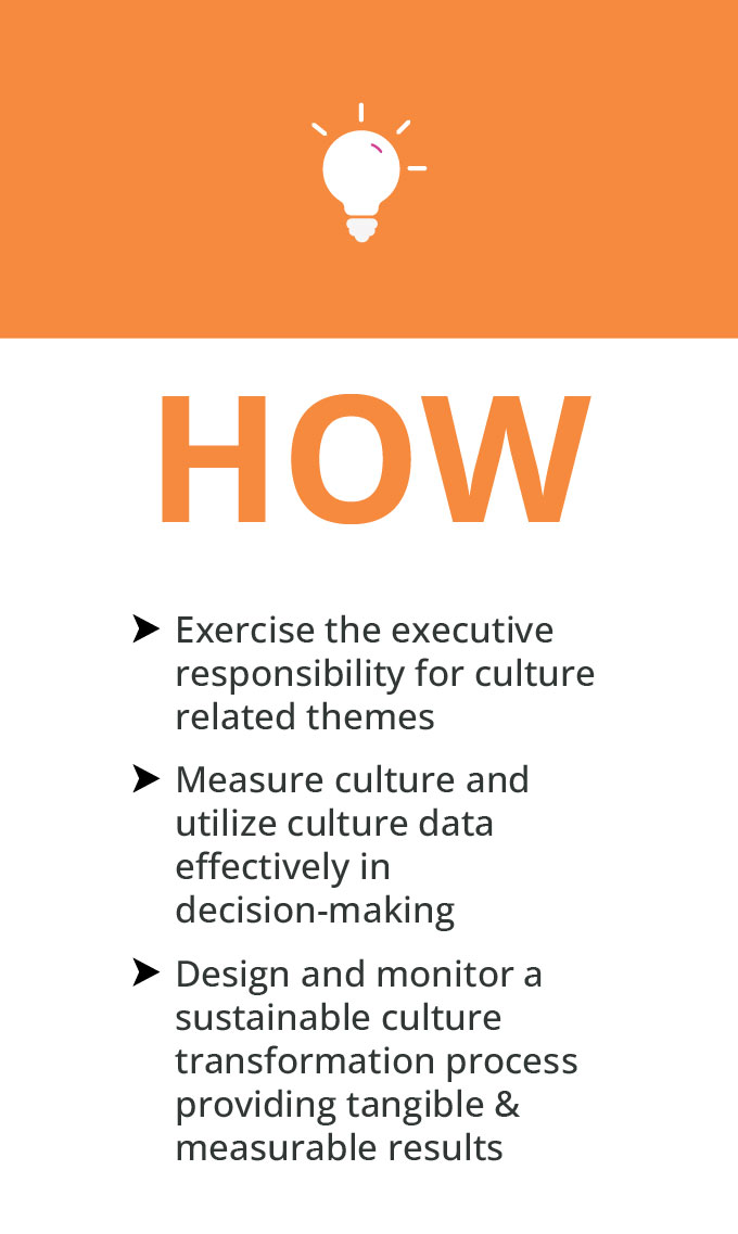 Understand the culture you already have in your organization, see how far it is from what you need it to be in order to achieve high performance, and plan a successful and sustainable transformation